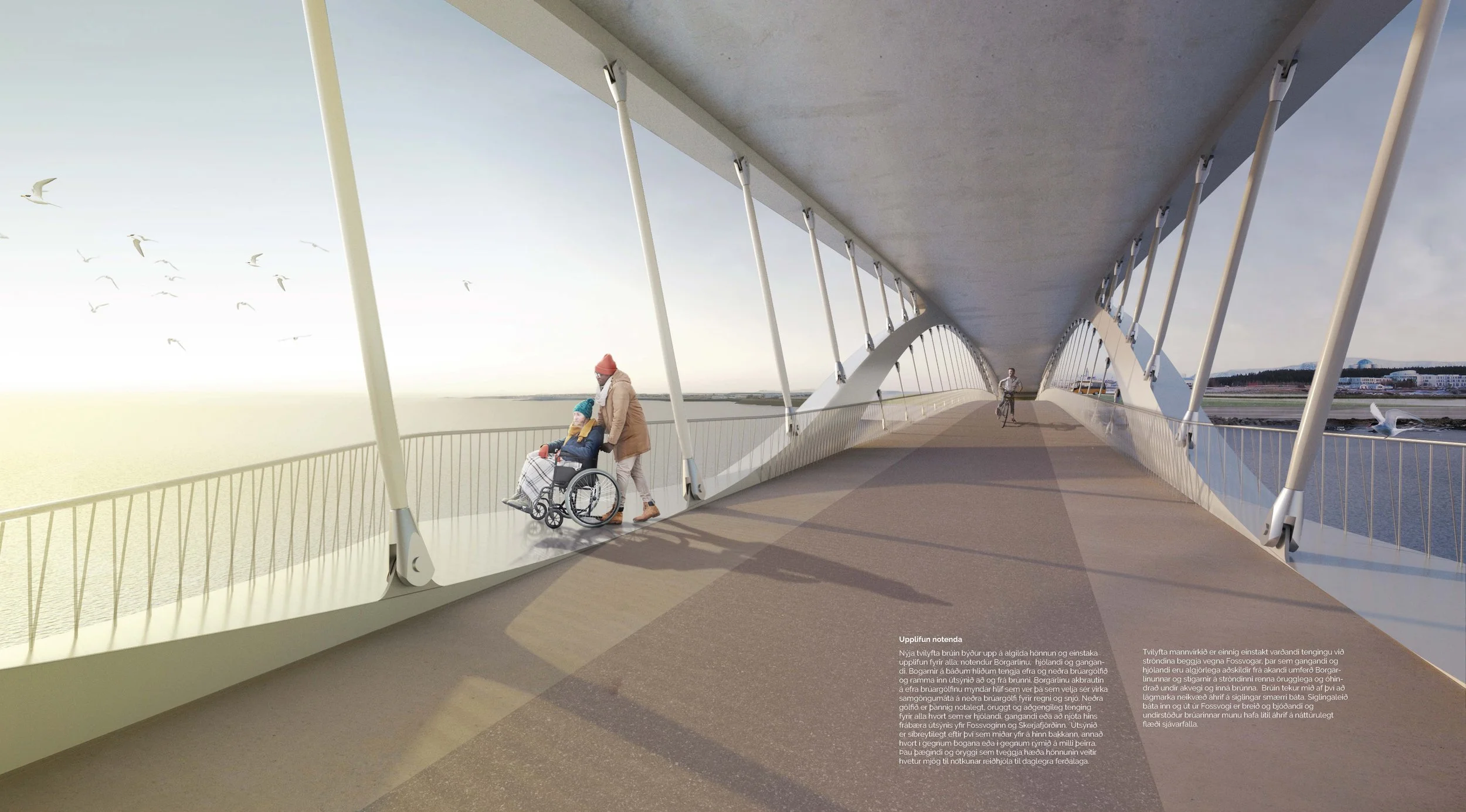 The location of the new Fossvogsbrú bridge is very special. The immediate surroundings of the bridge are shaped by a natural shoreline and the beauty of Fossvogur. In the distance Hallgrímskirkja and Reykjavík University form a counterbalance of the nature of the area around the bridge and the city center. The new Fossvogur bridge must be connected to its surroundings, dignified and in balance with the nature of the area. The natural environment is the reason for our decision to design from the classic shapes of the arch bridge, where soft lines and the basic advantages of a bow naturally tend to to be in balance with the environment. We propose to cross Fossvogur with three arches, with an increased length in the middle. The design is reminiscent of traditional Icelandic arch bridges such as the prestigious Hvítárbrú in Borgarfjörður. With the unusual combination of soft arches and the ideology behind the two-decks, the bridge will make the new Fossvogsbrú a catchy landmark in the vicinity of Reykjavík and Kópavogur. Fossvogur is crossed in three large steps. Some of the functions of the arcs are interconnected, which makes the center of the bridge open and inviting. The height of the bridge is determined by the nearby airport.